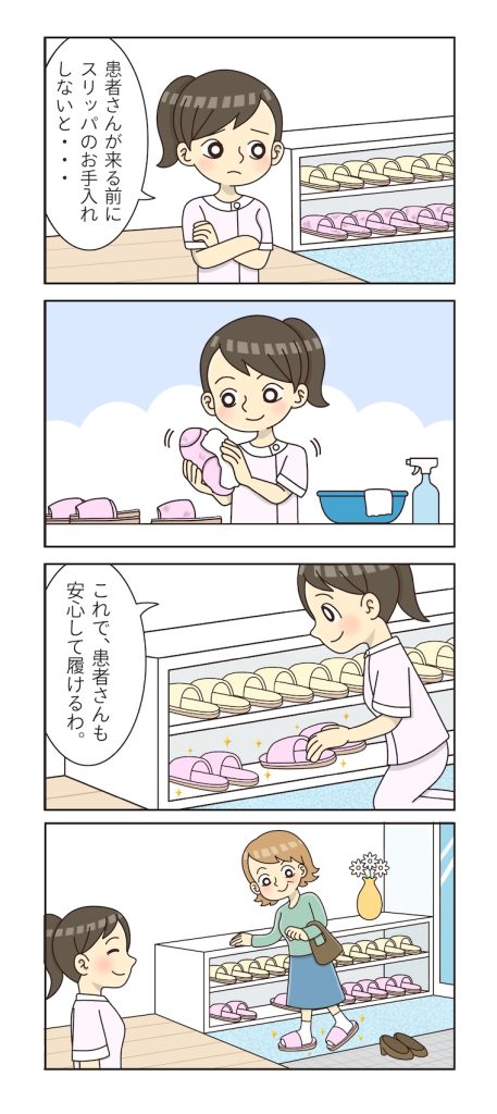 今回は、クリニックのスリッパを想定しお手入れの仕方をご説明します。